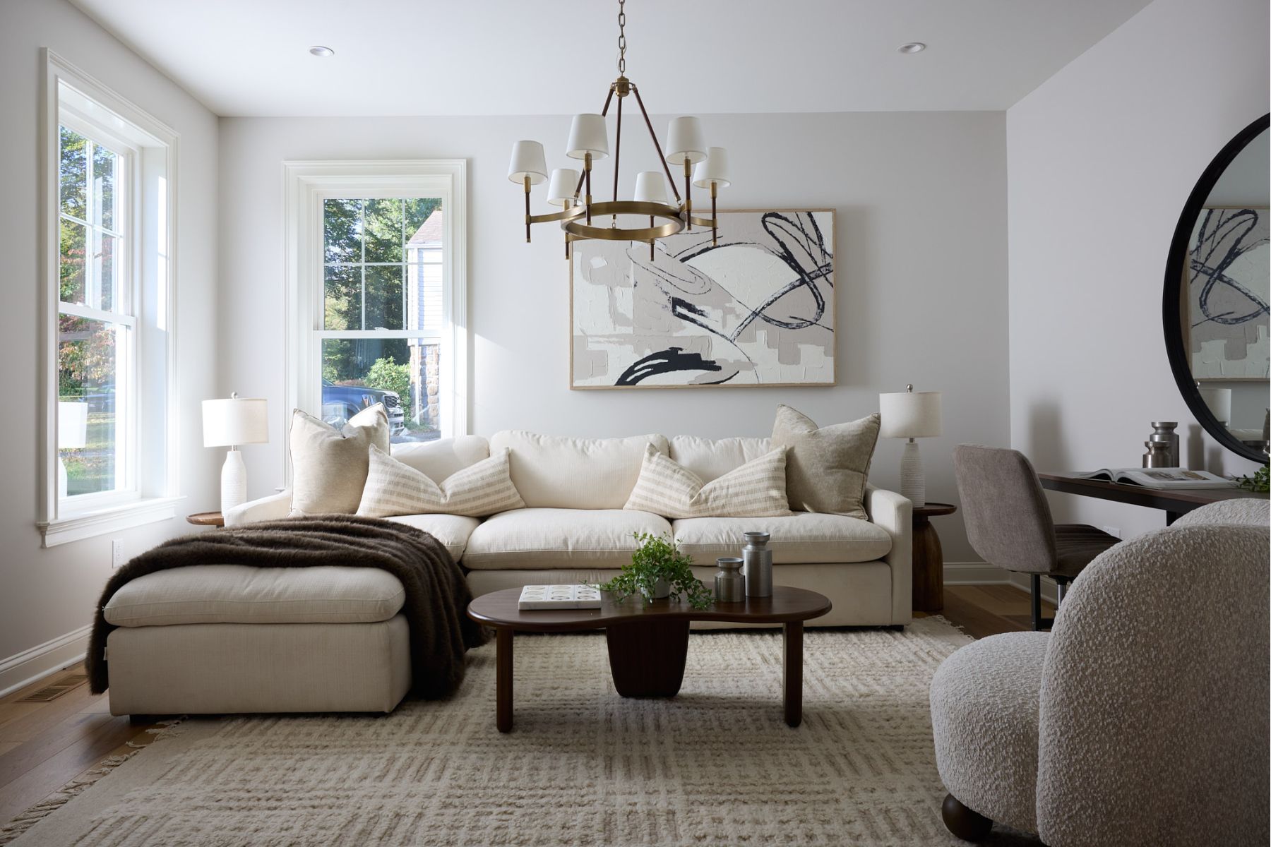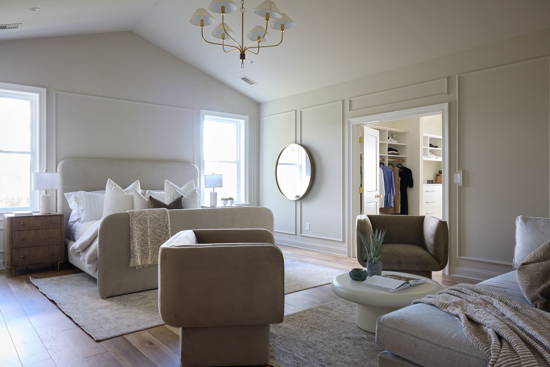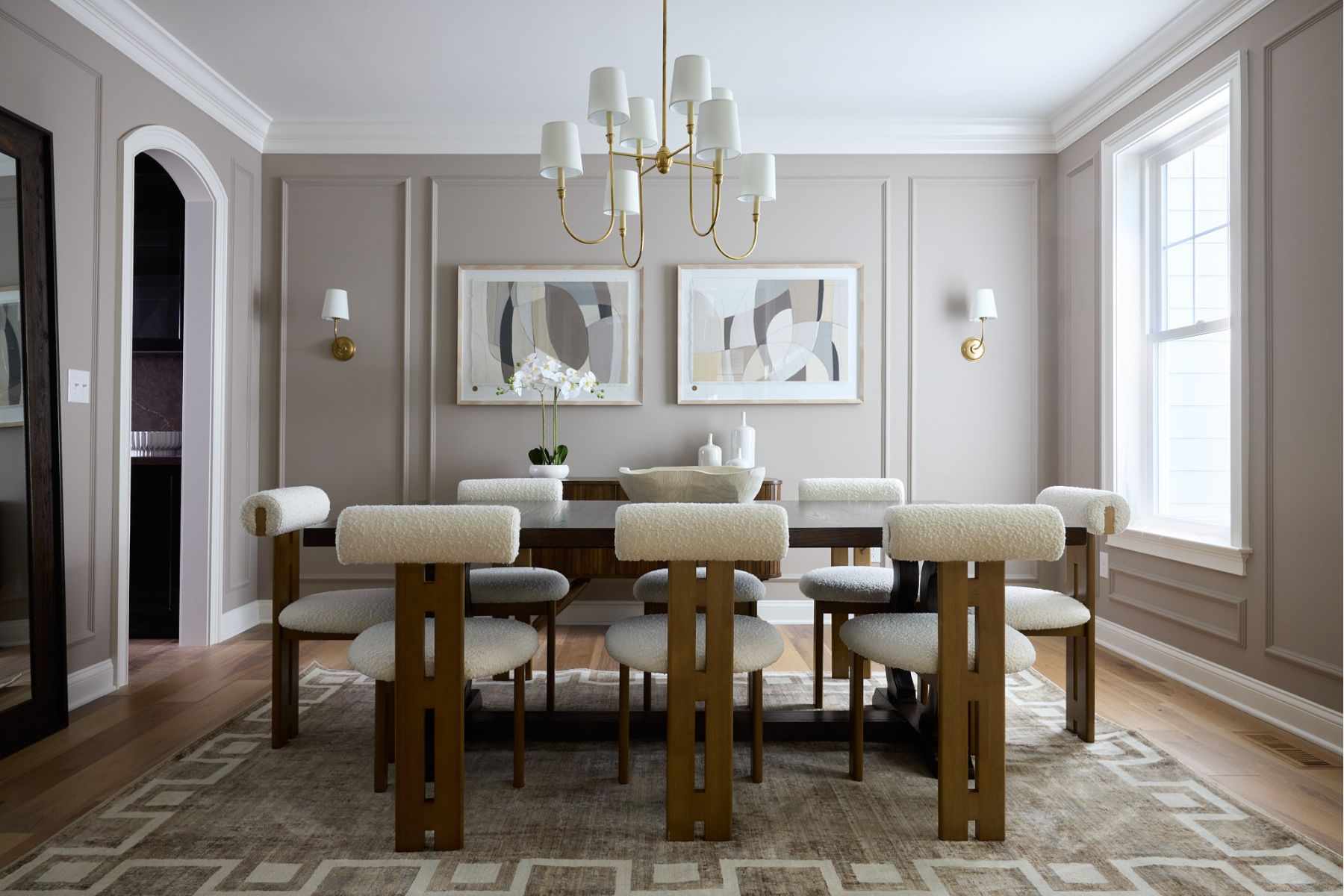 Inside, the home unfolds across more than 4,600 square feet of meticulously tailored living space. Every element—from architectural millwork to lighting and finishes—has been carefully selected to reflect a sense of quiet luxury. The main level is anchored by a sunlit kitchen featuring Rittenhouse cabinetry, soft white stone surfaces with warm veining, a custom range hood, and hand-rubbed antique brass lighting. A fully appointed scullery extends the culinary workspace with its own suite of high-end appliances and artisan finishes, while the butler’s pantry connects seamlessly to a formal dining room, elevating everyday moments and special occasions alike.