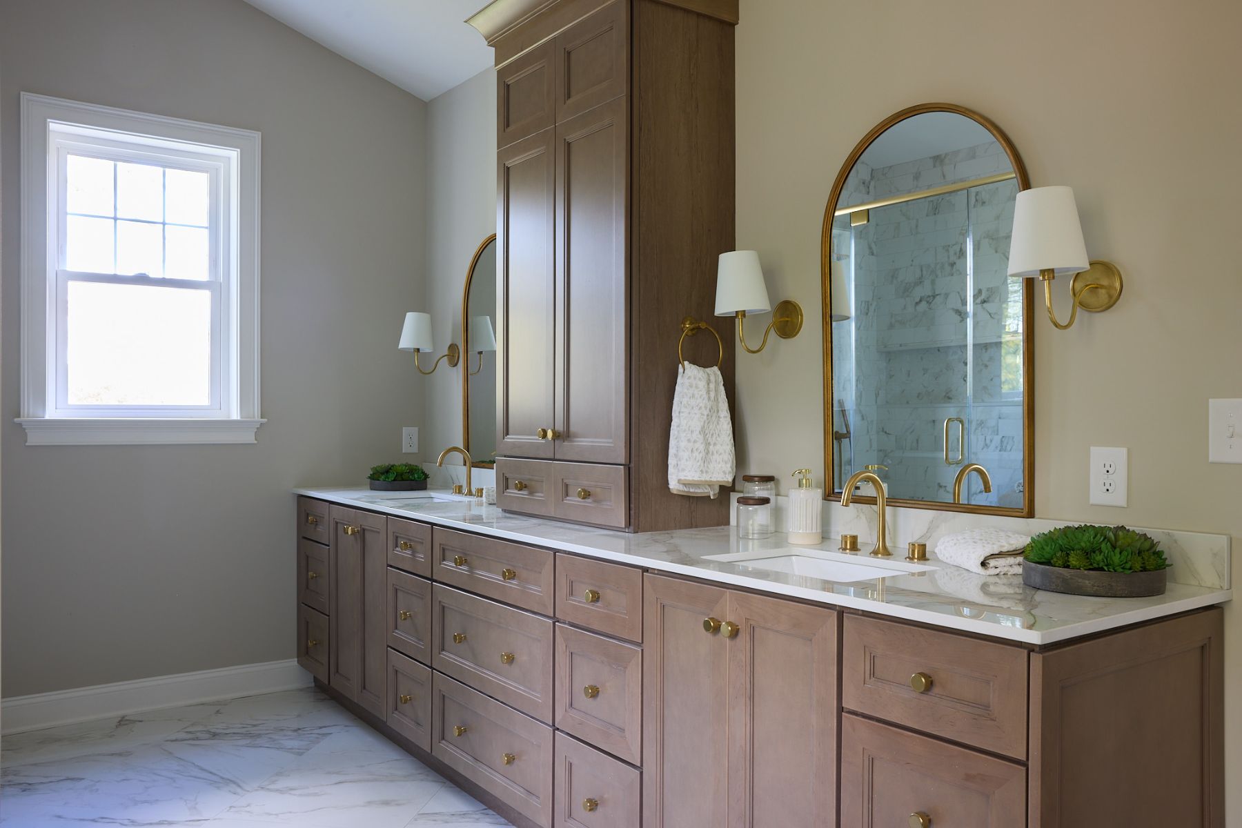 Upstairs, the owner’s suite is a private retreat designed with warmth and intention—featuring richly stained cabinetry, stone surfaces, layered lighting, and refined hardware in warm metallic tones. Thoughtful spatial flow, natural light, and luxurious textures create a primary bedroom and bath that feel both restorative and enduringly elegant. With a finished lower level, multiple flex spaces, and curated details throughout, Wooded Way is more than a home—it’s a handcrafted experience, tailored to the rhythms of elevated Main Line living.