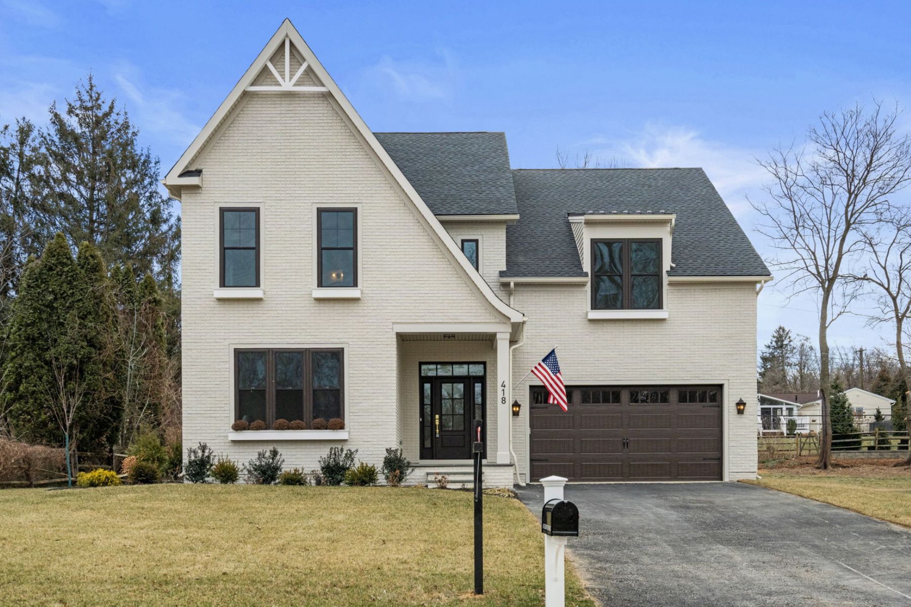 418 Glenway Road is a custom luxury home in Erdenheim offering over 3,800 square feet of refined living space with 4 bedrooms, 4.5 baths, and a finished basement. Set on a private lot, the home’s exterior pairs warm herringbone brick and siding with bronze windows, double front doors, and handcrafted window boxes—delivering timeless curb appeal with a modern edge.